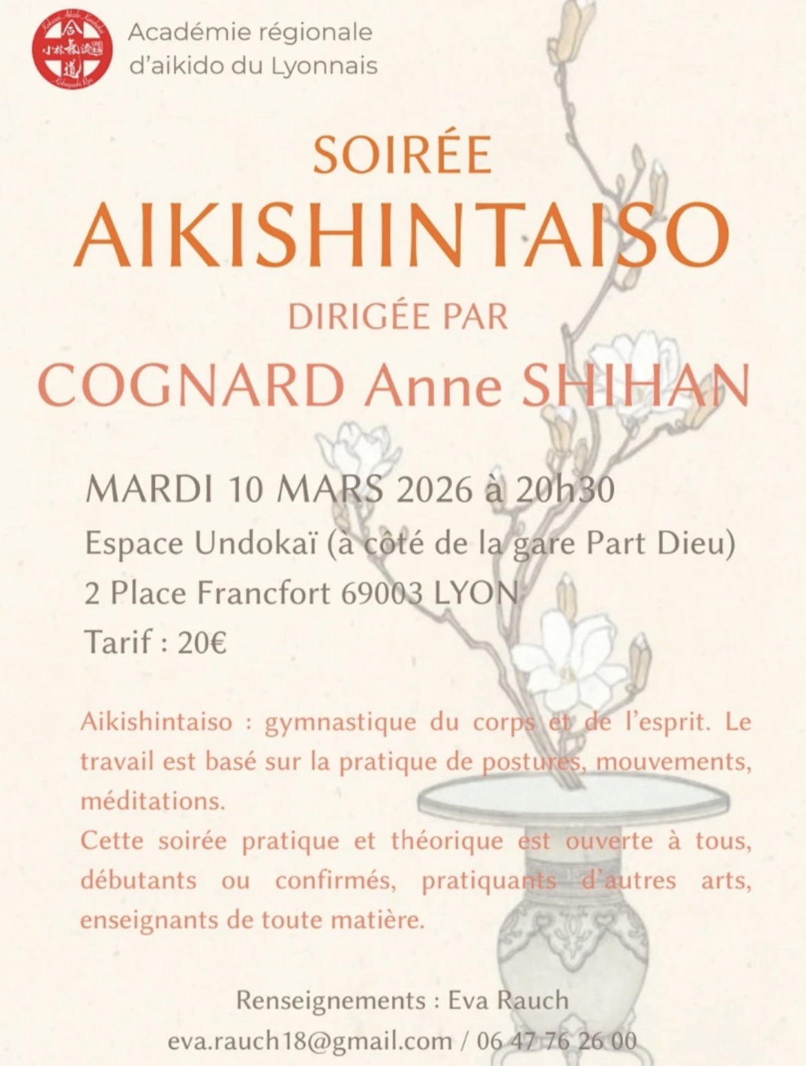 Cognard Anne Shihan dirigera une soirée aikishintaiso à Lyon le mardi 10 mars 2026 à 20h30